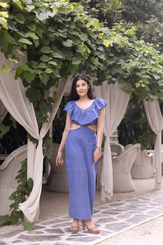 CHAMBRAY FRILL CUT OUT DRESS