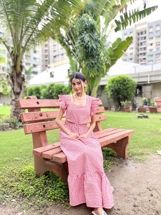 RED GINGHAM FRILL SLEEVE DRESS
