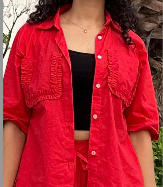 FRILL POCKET SHIRT COORD - RED